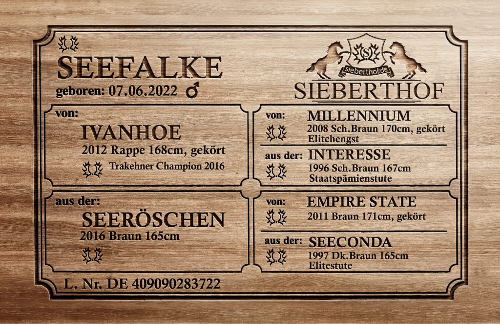 Seefalke inszeniert sich als junger Hoffnungsträger in selten auftretender qualitätsmäßig anspruchsvoller Übereinstimmung von Rasse- und Geschlechtstyp, bedeutenden Körperformen und vor allem drei gleichmäßig schwungvolle, energischen und dynamischen Grundgangarten. Sein Vater Ivanhoe zählt längst zu den vererbungsstärksten und von daher besonders renommierten Millennium-Söhnen und firmiert als Erzeuger von Spitzenstuten, auch inzwischen auf der S-Dressurbühne angekommenen Sportpferden. Hohe Rittigkeit und vorbildliche Leistungsbereitschaft wurden ihnen in die Wiege gelegt. Die Mutter ist eine Dreiviertelschwester des Hauptvererbers Schwarzgold und der Grand Prix Championesse Standing O’Vation TSF.
