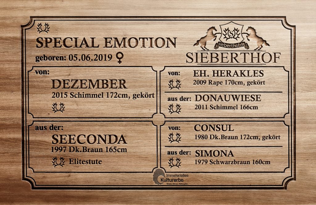 Special Emotion‘s Mutter Seeconda besitzt bereits zu Lebzeiten Legendenstatus: Unter ihren 16 Nachkommen befinden sich nicht weniger als fünf, die sich im Turniersport gleich mehrerer Disziplinen, vornehmlich jedoch in Dressurkonkurrenzen bis zur höchsten Ebene zu behaupten wussten. Dazu zählen der zweimalige Hessenmeister Sir Arthur TSF v. Buddenbrock, die Imperio-Tochter Standing O‘Vation TSF, Special Selection v. Imhotep, der in internationalen Vielseitigkeitschampionaten erfolgreiche Sean Connery v. Connery und schließlich der Imperio-Sohn Schwarzgold, der sich längst die Position eines Hauptvererbers erworben hat. Ganz aktuell stand Seeconda wieder einmal im Mittelpunkt der züchterischen Szenerie, denn in der vergangenen Zuchtsaison 2022 zeichnete sie als Mutter von Special Emotion v. Dezember, der gefeierten Reservesiegerin der Zentralen Stuteneintragung Niedersachsen-Hannover, verantwortlich.